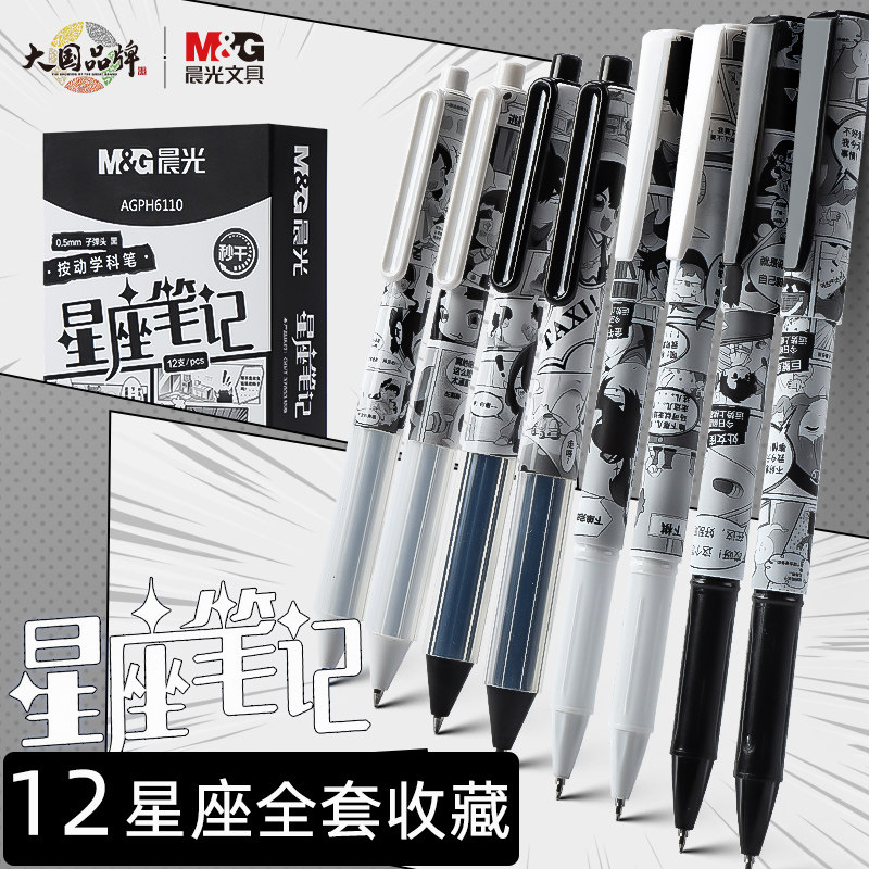 晨光星座笔记系列全套12支中性笔学科笔学生用st笔头秒干0.5黑色按压式中性笔超萌拔盖星座笔动漫图案刷题笔热门设计联盟服务商