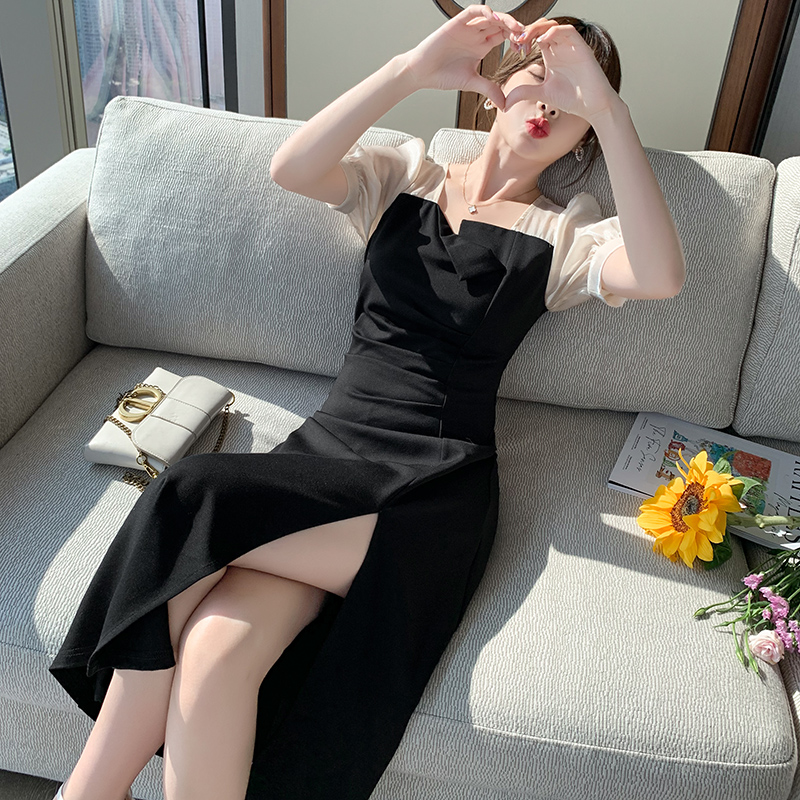 连衣蠕他2显瘦黑色开叉小黑裙2021夏季新款气质名媛女 品牌高腰热门设计联盟服务商